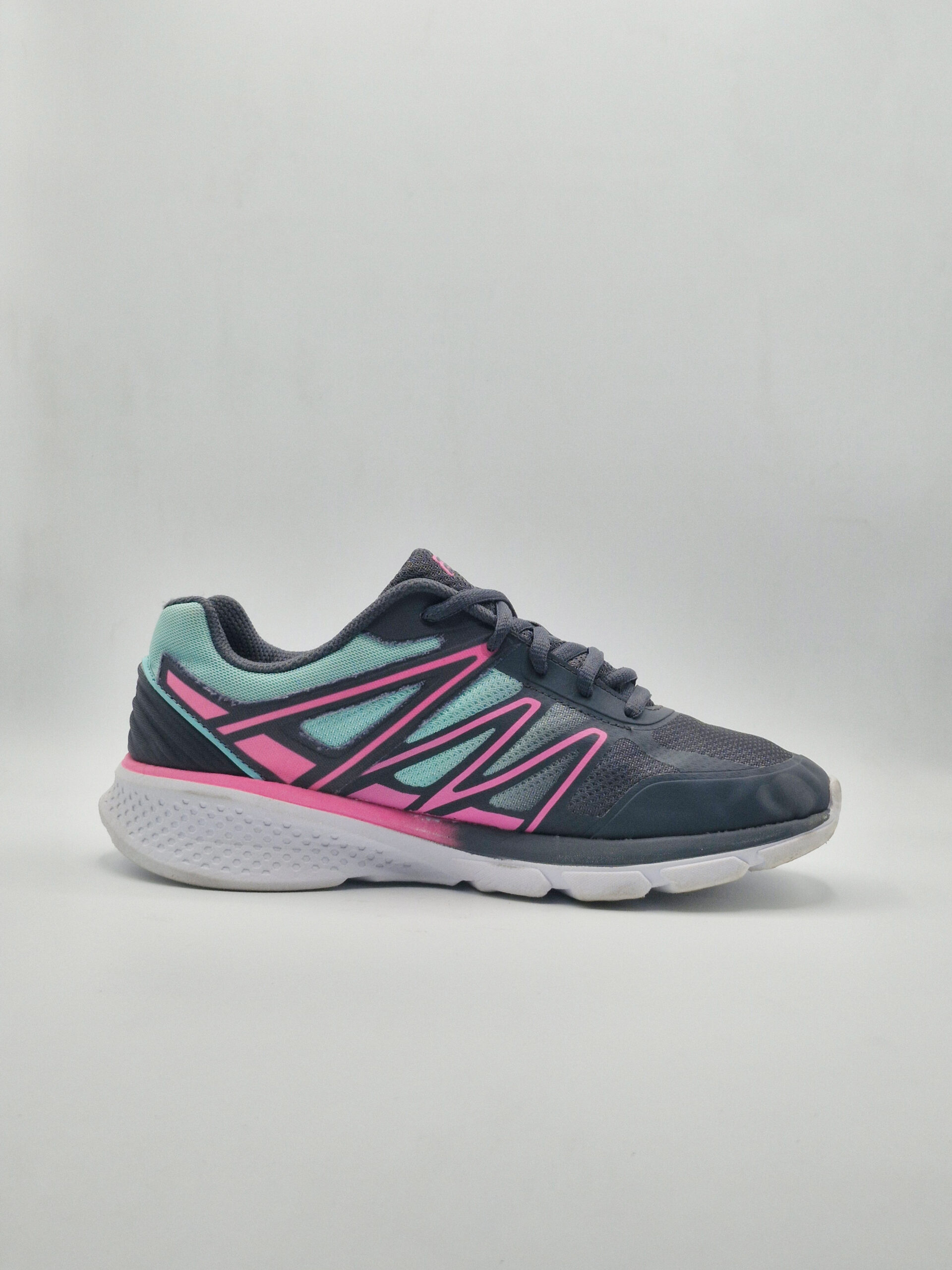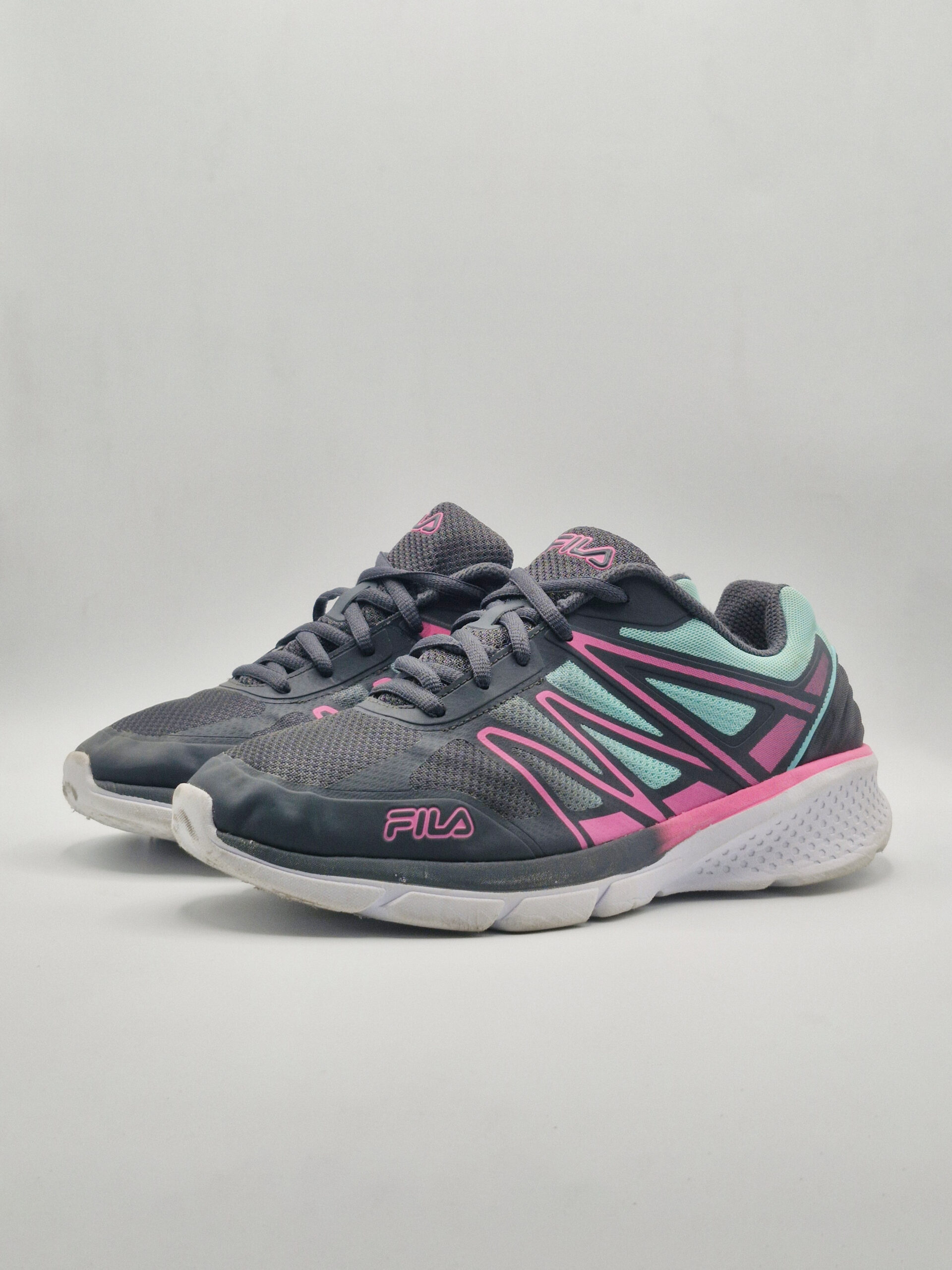 Fila Women’s Memory Superstride 3 running shoes in a grey, pink, and turquoise colorway.