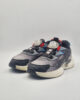 grey and black running shoes with red accents and a white sole.